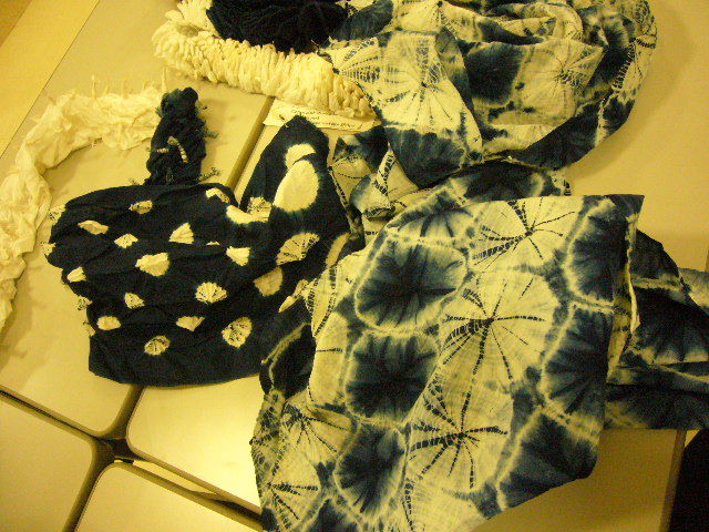 下記の写真は、絞りの見本と染色後の糸を外したところです。