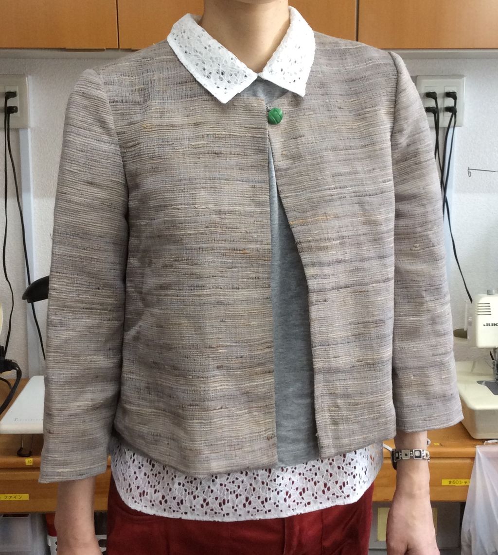ボレロは、 シルク地です。裏側をお見せできないのが残念ですが、裏なしで縫い代はパイピングで始末しました。