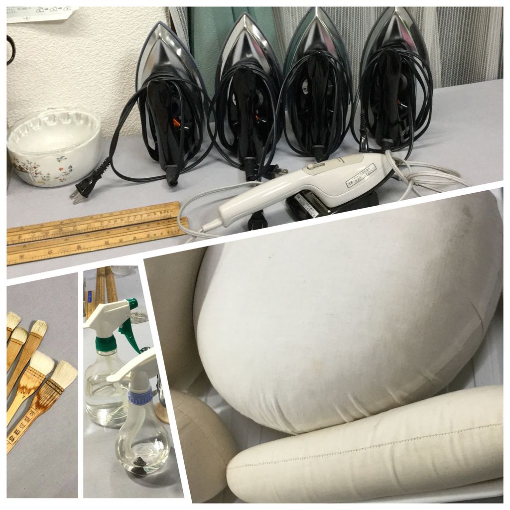 左中の刷毛に水を含ませ縫い代の裏側からアイロンをします。その後すぐに羽子板で押さえ水分を取ってあげるのです。