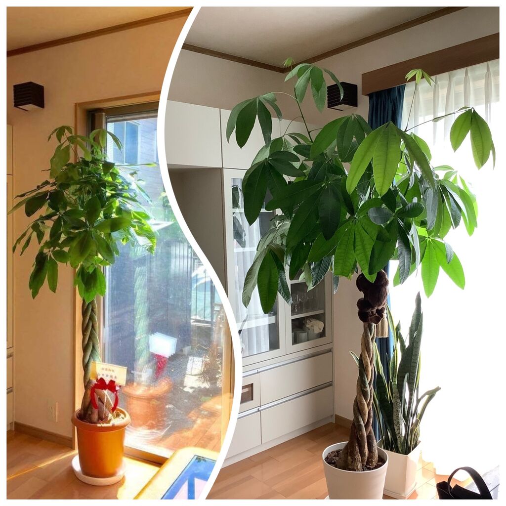 写真左は 3年ほど前、自宅を建て替えた時頂戴したパキラです。