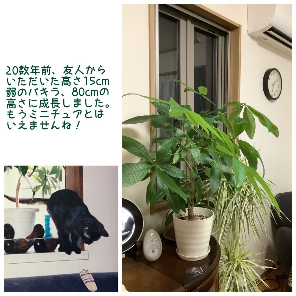 ニャンの後ろのパキラは、20年程前で鉢を少し大きなものに変えた頃です。